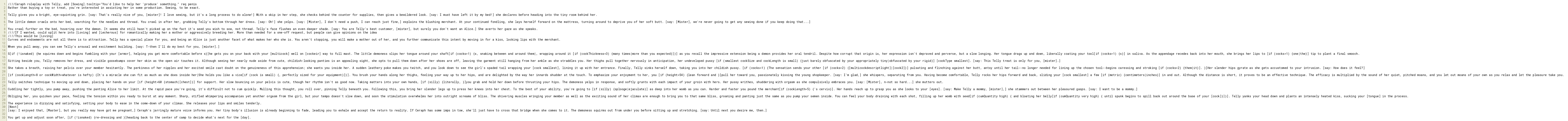 You crawl further on the bed, hovering over the demon. It seems she still hasn't picked up on the fact it's seed you wish to sow, not thread. Telly's face flushes an even deeper shade. [say: You are Telly's best customer, [mister], but surely you don't want an Alice.] She averts her gaze as she speaks.