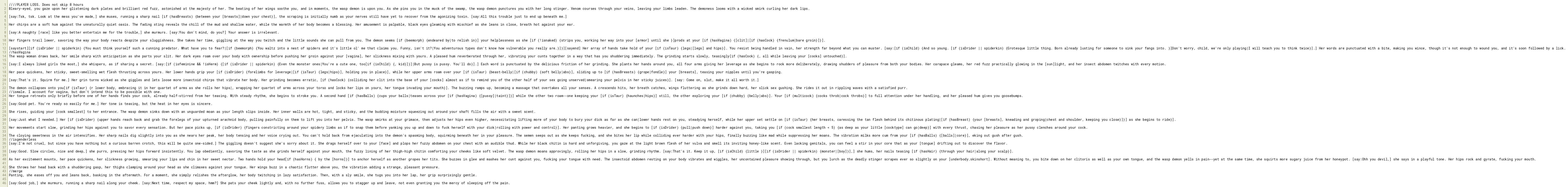 Her fingers trail lower, savoring the way your body reacts despite your sluggishness. She takes her time, giggling at the way you twitch and the little sounds she can pull from you. The demon seems [if (beemorph) {endeared by|to relish in}] your helplessness as she [if (!isnaked) {strips you, working her way into your [armor] until she }]prods at your [if (hasVagina) {[clit]|[if (hasCock) {frenulum|bare groin}]}].