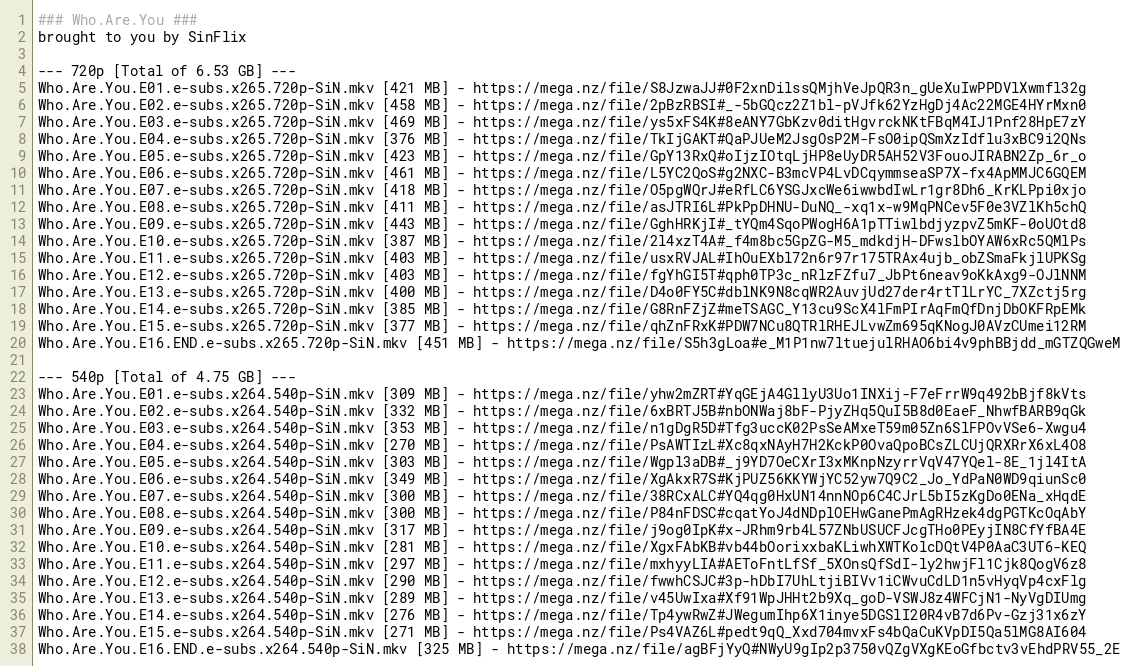 Who.Are.You.E01.e-subs.x264.540p-SiN.mkv [309 MB] - https://mega.nz/file/yhw2mZRT#YqGEjA4GllyU3Uo1INXij-F7eFrrW9q492bBjf8kVts