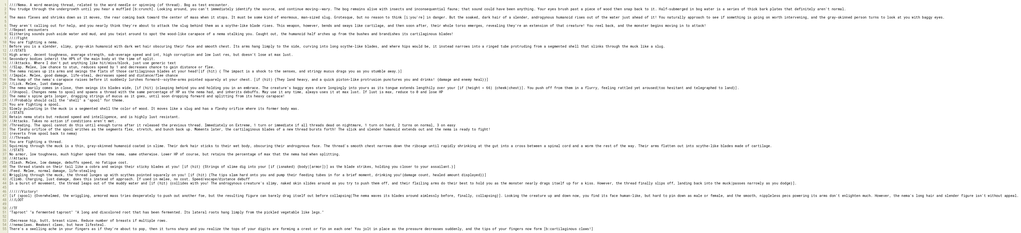 [if (spool) {Overwhelmed, the wriggling, armored mass tries desperately to push out another foe, but the resulting figure can barely drag itself out before collapsing|The nema waves its blades around aimlessly before, finally, collapsing}]. Looking the creature up and down now, you find its face human-like, but hard to pin down as male or female, and the smooth, nippleless pecs powering its arms don't enlighten much. However, the nema's long hair and slender figure isn't without appeal.