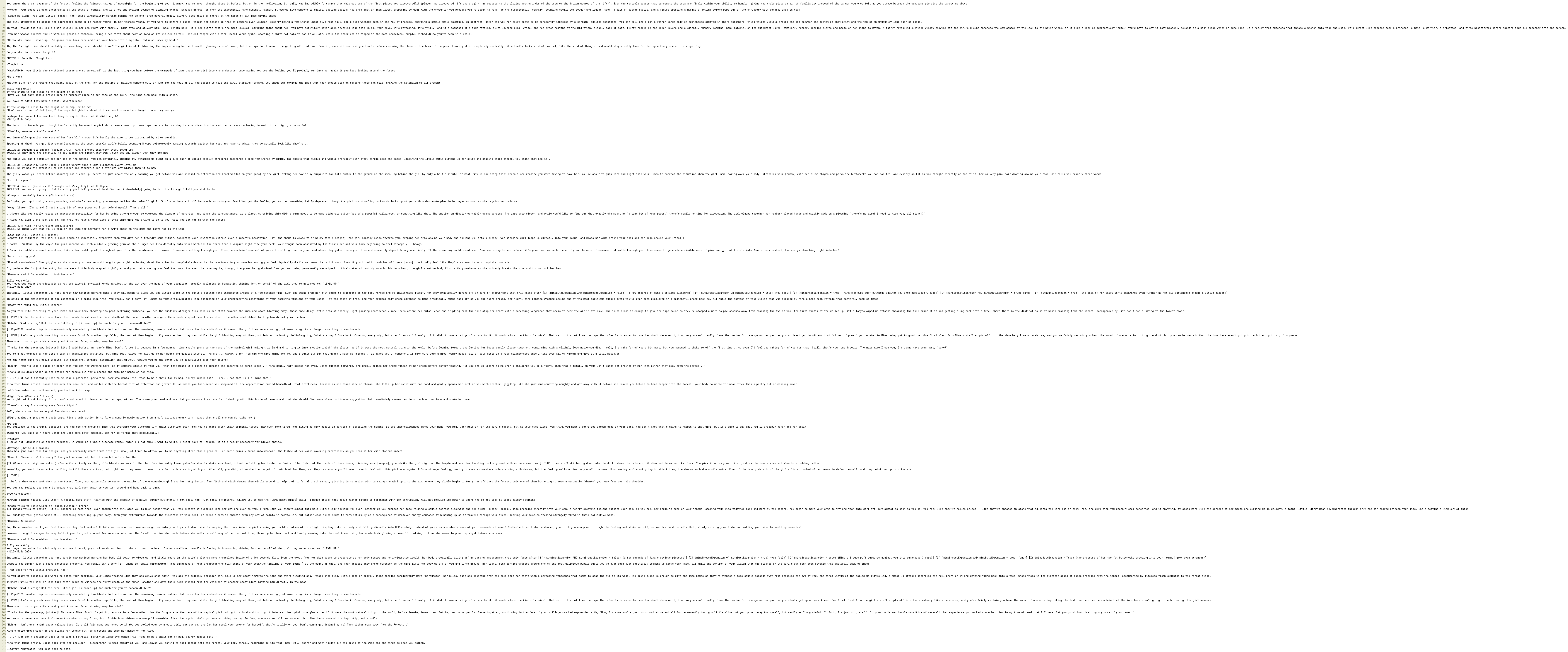 Instantly, little scratches you just barely now noticed marring Mina's body all begin to close up, and little tears in the cutie's clothes mend themselves inside of a few seconds flat. Even the sweat from her skin seems to evaporate as her body renews and re-invigorates itself, her body practically giving off an aura of empowerment that only fades after [if (minaButtExpansion AND minaBreastExpansion = false) {a few seconds of Mina's obvious pleasure}] [If (minaBreastExpansion OR minaButtExpansion = true) {you feel}] [If (minaBreastExpansion = true) {Mina's B-cups puff outwards against you into sumptuous C-cups}] [If (minaBreastExpansion AND minaButtExpansion = true) {and}] [If (minaButtExpansion = true) {the back of her skirt tents backwards even further as her big buttcheeks expand a little bigger}]!