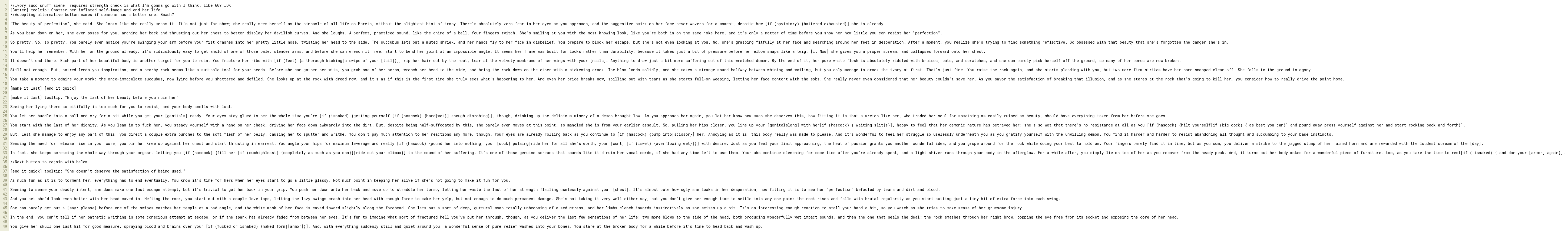 In the end, you can't tell if her pathetic writhing is some conscious attempt at escape, or if the spark has already faded from between her eyes. It's fun to imagine what sort of fractured hell you've put her through, though, as you deliver the last few sensations of her life: two more blows to the side of the head, both producing wonderfully wet impact sounds, and then the one that seals the deal: the rock smashes through her right brow, popping the eye free from its socket and exposing the gore of her head.