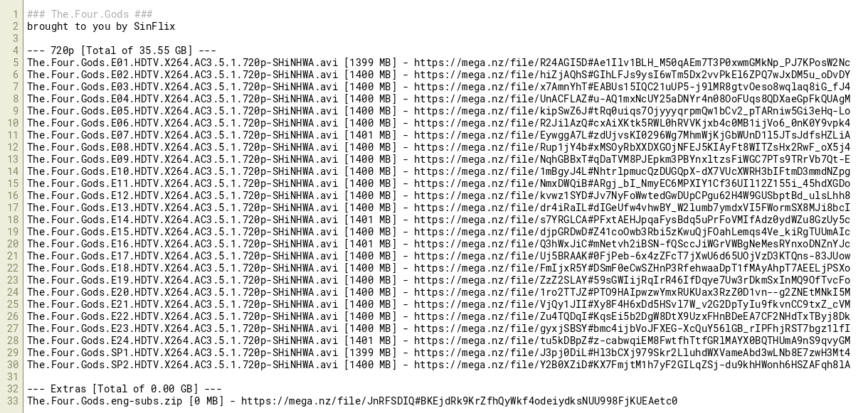 The.Four.Gods.E04.HDTV.X264.AC3.5.1.720p-SHiNHWA.avi [1400 MB] - https://mega.nz/file/UnACFLAZ#u-AQ1mxNcUY25aDNYr4n08OoFUqs8QDXaeGpFkQUAgM