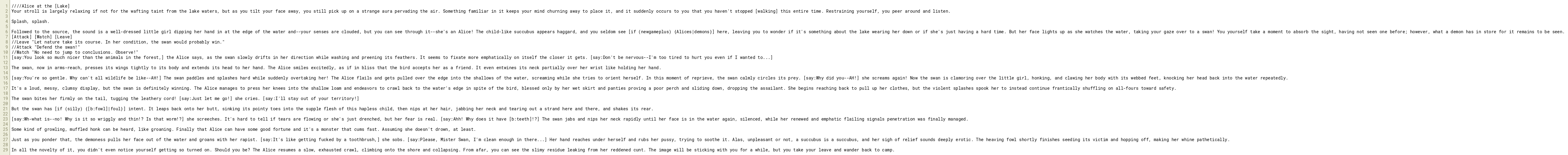 Followed to the source, the sound is a well-dressed little girl dipping her hand in at the edge of the water and--your senses are clouded, but you can see through it--she's an Alice! The child-like succubus appears haggard, and you seldom see [if (newgameplus) {Alices|demons}] here, leaving you to wonder if it's something about the lake wearing her down or if she's just having a hard time. But her face lights up as she watches the water, taking your gaze over to a swan! You yourself take a moment to absorb the sight, having not seen one before; however, what a demon has in store for it remains to be seen.