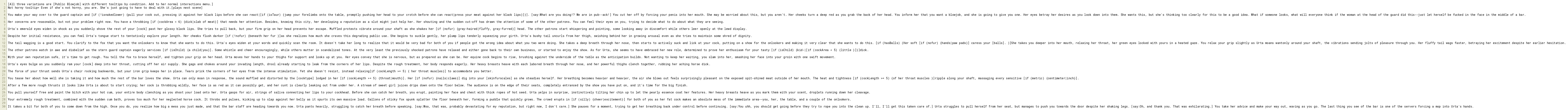 You make your way over to the guard captain and [if (!isnakedlower) {pull your cock out, pressing it against her black lips before she can react|[if (isTaur) {jump your forelimbs onto the table, promptly pushing her head to your crotch before she can react|press your meat against her black lips}]}]. [say:What are you doing!? We are in pub--ack!] You cut her off by forcing your penis into her mouth. She may be worried about this, but you aren't. Her cheeks turn a deep red as you grab the back of her head. You inform her that you want a blowjob, and she is going to give you one. Her eyes betray her desires as you look down into them. She wants this, but she's thinking too clearly for this to be a good idea. What if someone looks, what will everyone think if the woman at the head of the guard did this--just let herself be fucked in the face in the middle of a bar.