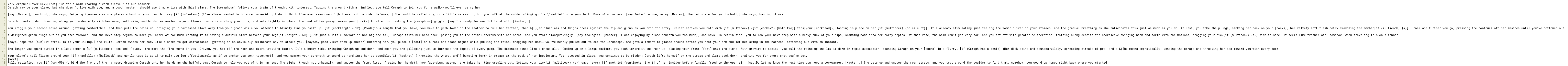 [say:I hope the [sun]lit stroll is to your liking,] she lilts. Ceraph twists her body like a snake to get comfortable, gyrating in an obviously deliberate way to stroke you. [say:Any good views from up there?] Humoring her, you place a [foot] on a rock and stand higher while pulling the reins, dragging her until you've nearly pulled out to see the landscape. She gets a moment to glance around before you rest your arm and let her swing in the harness, bottoming out with an instant.