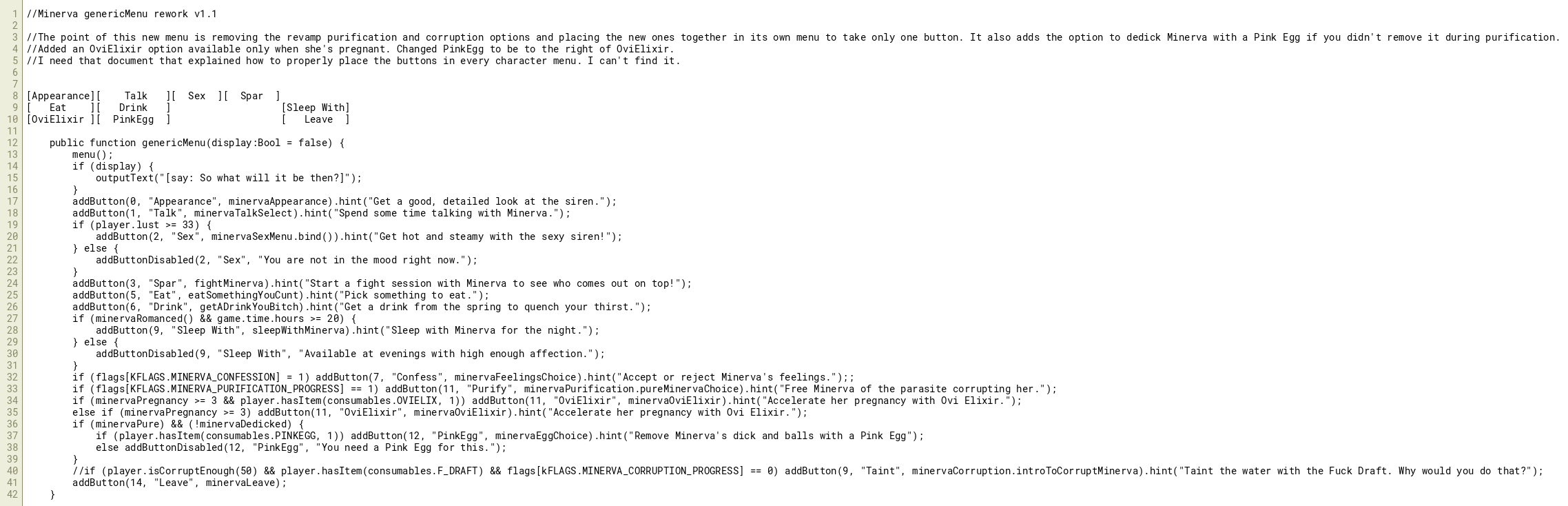 else if (minervaPregnancy >= 3) addButton(11, "OviElixir", minervaOviElixir).hint("Accelerate her pregnancy with Ovi Elixir.");