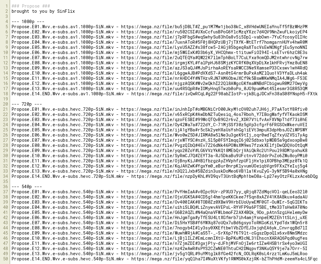 Propose.E13.Wvv.e-subs.hevc.540p-SiN.mkv - https://mega.nz/file/jv5g1QRL#9uYMtglk8fGe42fcN_OOLRqK0sL4rzz1LmKuJ5mLRoo