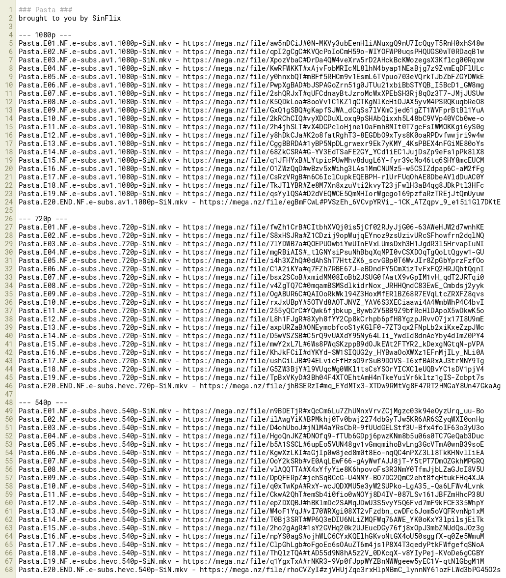 Pasta.E20.END.NF.e-subs.av1.1080p-SiN.mkv - https://mega.nz/file/egBmFCwL#PVSzEh_6VCvpYRVi_-1CK_ATZqpv_9_e15i1Gl7DKtE