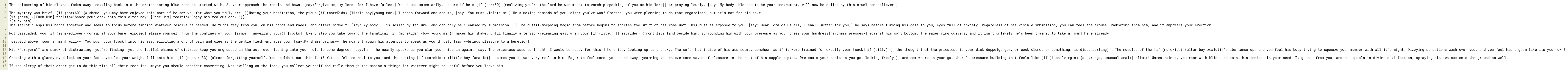 His \"prayers\" are somewhat distracting, you're finding, yet the lustful whines of distress keep you engrossed in the act, even leaning into your role to some degree. [say:Th--] he nearly speaks as you slam your hips in again. [say: The priestess assured I--ah!--I would be ready for this,] he cries, looking up to the sky. The soft, hot inside of his ass seems, somehow, as if it were trained for exactly your [cock][if (silly) {--the thought that the priestess is your dick-doppelganger, or cock-clone, or something, is disconcerting}]. The muscles of the [if (moreKids) {altar boy|zealot}]'s abs tense up, and you feel his body trying to squeeze your member with all it's might. Dizzying sensations wash over you, and you feel his orgasm like its your own!