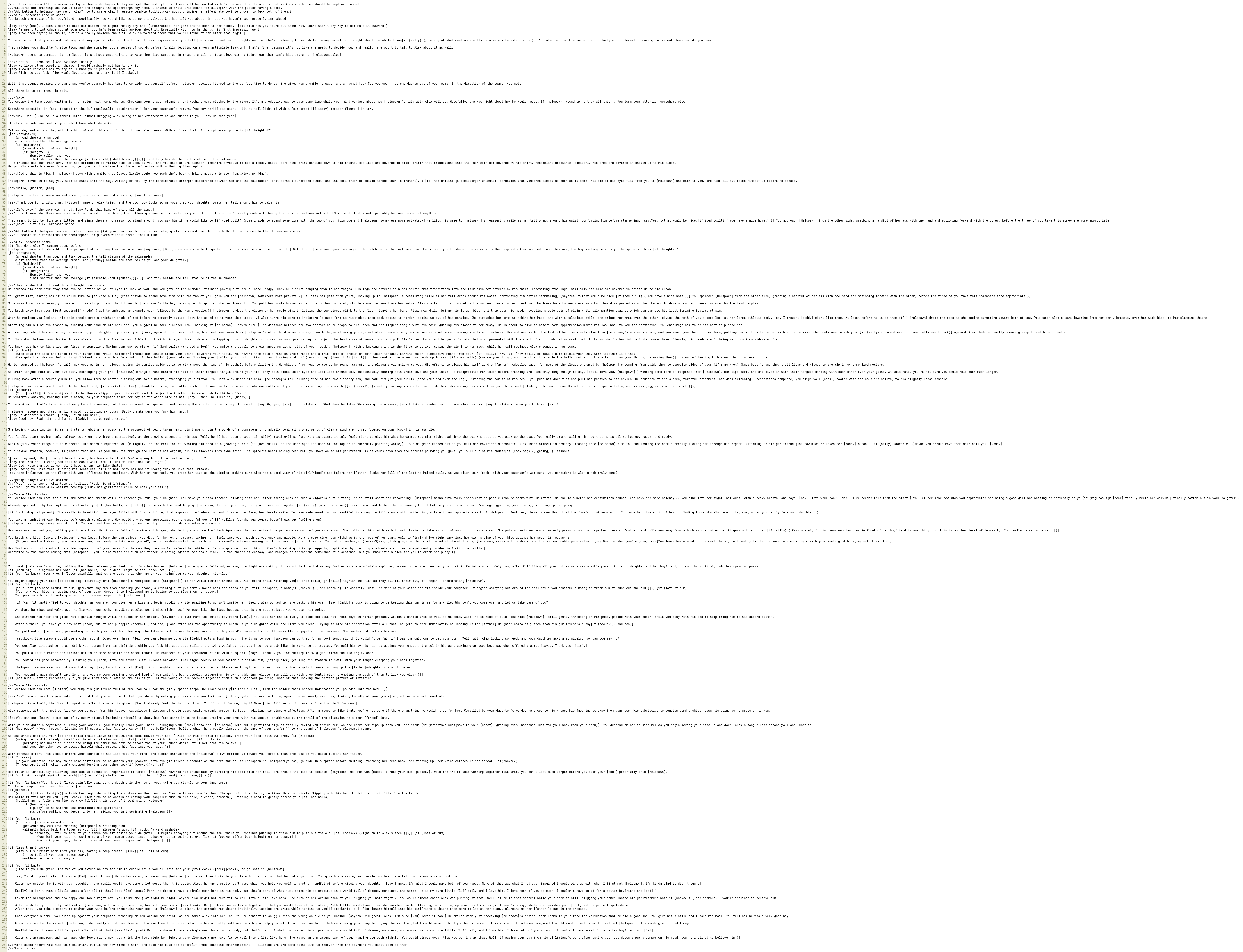 You decide Alex can rest for a bit and catch his breath while he watches you fuck your daughter. You move your hips forward, sliding into her. After taking Alex on such a vigorous butt-rutting, he is still spent and recovering. [Helspawn] moans with every inch//what do people measure cocks with in metric? No one is a meter and centimeters sounds less sexy and more sciency.// you sink into her tight, wet cunt. With a heavy breath, she says, [say:I love your cock, [dad]. I've needed this from the start.] You let her know how much you appreciated her being a good girl and waiting so patiently as you[if (big cock){r [cock] finally meets her cervix.| finally bottom out in your daughter.}]