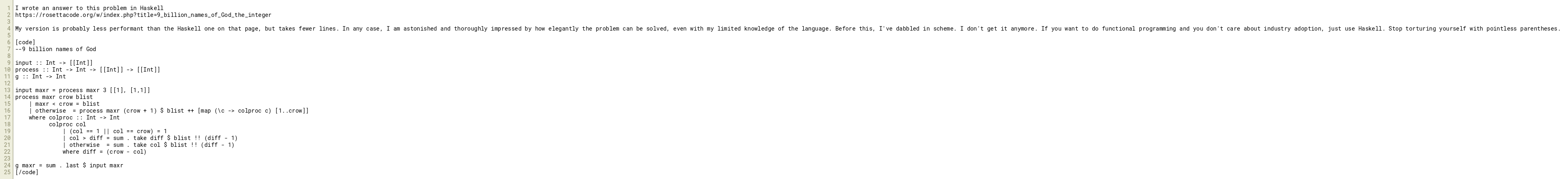 My version is probably less performant than the Haskell one on that page, but takes fewer lines. In any case, I am astonished and thoroughly impressed by how elegantly the problem can be solved, even with my limited knowledge of the language. Before this, I've dabbled in scheme. I don't get it anymore. If you want to do functional programming and you don't care about industry adoption, just use Haskell. Stop torturing yourself with pointless parentheses.