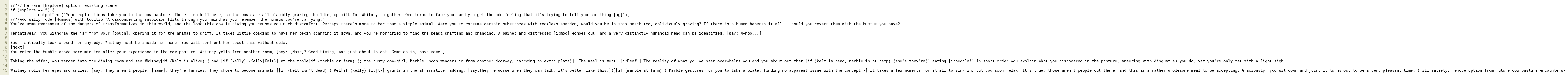 Whitney rolls her eyes and smiles. [say: They aren't people, [name], they're furries. They chose to become animals.][if (kelt isn't dead) { Kel[if (kelly) (ly|t}] grunts in the affirmative, adding, [say:They're worse when they can talk, it's better like this.]}][if (marble at farm) { Marble gestures for you to take a plate, finding no apparent issue with the concept.}] It takes a few moments for it all to sink in, but you soon relax. It's true, those aren't people out there, and this is a rather wholesome meal to be accepting. Graciously, you sit down and join. It turns out to be a very pleasant time. {fill satiety, remove option from future cow pasture encounters}