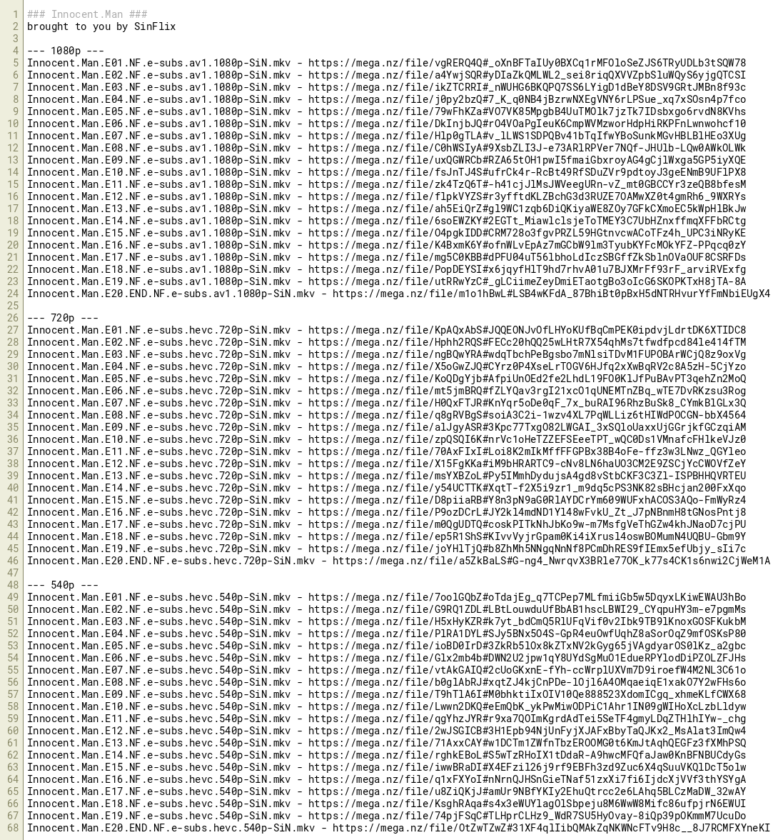 Innocent.Man.E20.END.NF.e-subs.hevc.540p-SiN.mkv - https://mega.nz/file/OtZwTZwZ#31XF4qlIibQMAkZqNKWNcFTv9H8c__8J7RCMFXYneKI