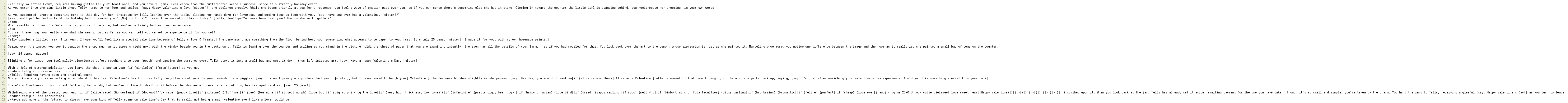 Now you know why you're expecting more: she did this last Valentine's Day too! Has Telly forgotten about you? To your reminder, she giggles. [say: I know I gave you a picture last year, [mister], but I never asked to be [b:your] Valentine.] The demoness blushes slightly as she pauses. [say: Besides, you wouldn't want an[if (alice race){other}] Alice as a Valentine.] After a moment of that remark hanging in the air, she perks back up, saying, [say: I'm just after enriching your Valentine's Day experience! Would you like something special this year too?]