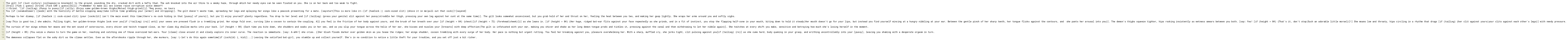 The curtain of her wings echoes her moans and the wet sound of outercourse, every shiver and twitch trapped close, as her claws dig shallow marks into your back. [if (height > 84) {Each time you bite down, she shudders and soaks you in her sex, and as you slip your tongue across the helix of her ear, she kisses and nuzzles your [breasts] with deep affection|The gilt is infatuated with your ear, making you shiver and shake as her long demon tongue prods and tickles it, pressing against the canal and then withdrawing to let her nibble again}]. She twitches at every shift you make, sensitive and betraying how much she's losing herself in the moment.