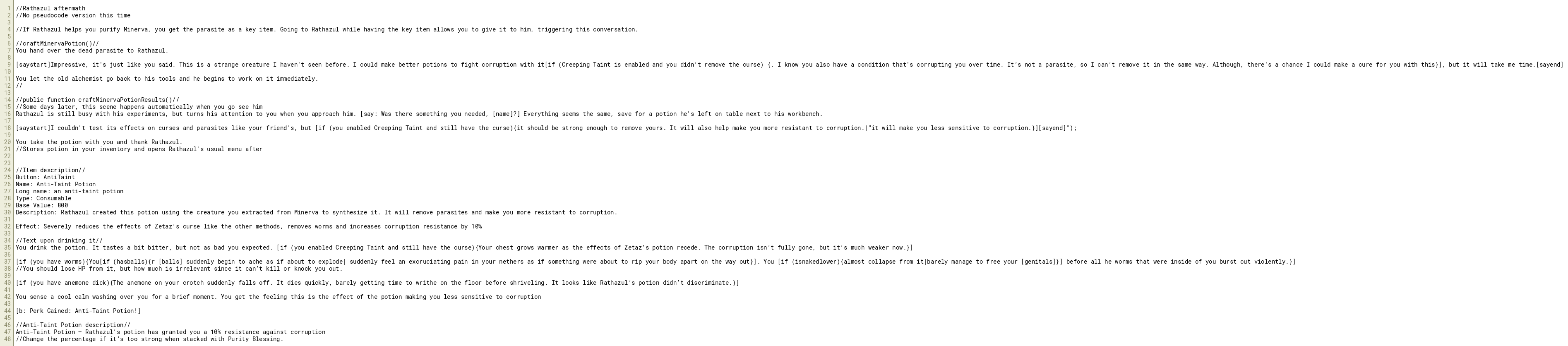 [saystart]I couldn't test its effects on curses and parasites like your friend's, but [if (you enabled Creeping Taint and still have the curse){it should be strong enough to remove yours. It will also help make you more resistant to corruption.|"it will make you less sensitive to corruption.}][sayend]");
