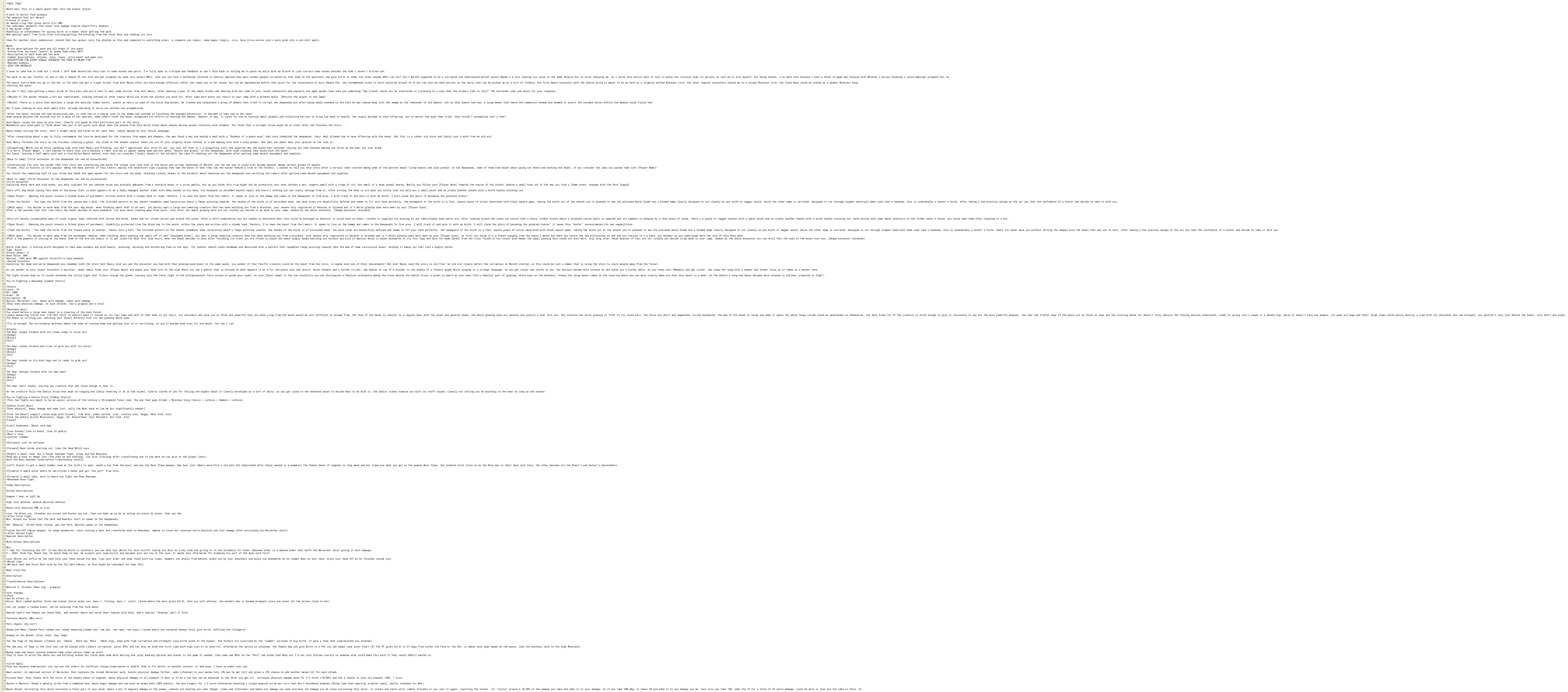 The quest starts when you go to the bar in Tel'adre and get a [Light Drink] from Aunt Nancy after you have enough affection (After she rapes you in her house) but can be implemented before that point for the convenience of pure female PCs, the recommended Level to start would be around 14-15 but can also be done earlier so the early loot can be picked up as a sort of freebie, the first Beast encounter with the Goblin Druid is meant to be as hard as a slightly buffed Minotaur Lord, the later regular encounters should be as a normal Minotaur Lord, the final Boss could be scaled as a weaker Minotaur King.