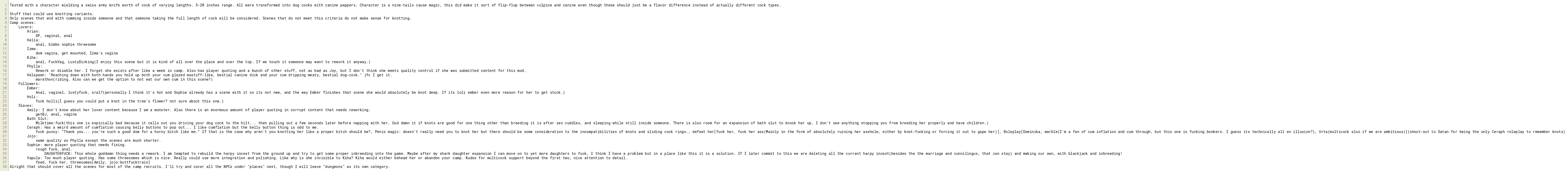 DAUGHTERFUCK: This whole goddamn thing needs a rework. I am tempted to rebuild the harpy incest from the ground up and try to get some proper inbreeding into the game. Maybe after my shark daughter expansion I can move on to yet more daughters to fuck, I think I have a problem but in a place like this it is a solution. If I later commit to this we are deleting all the current harpy incest(besides the the marriage and cunnilingus, that can stay) and making our own, with blackjack and inbreeding!