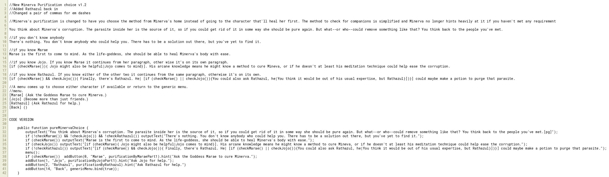 //Minerva's purification is changed to have you choose the method from Minerva's home instead of going to the character that'll heal her first. The method to check for companions is simplified and Minerva no longer hints heavily at it if you haven't met any requirement
