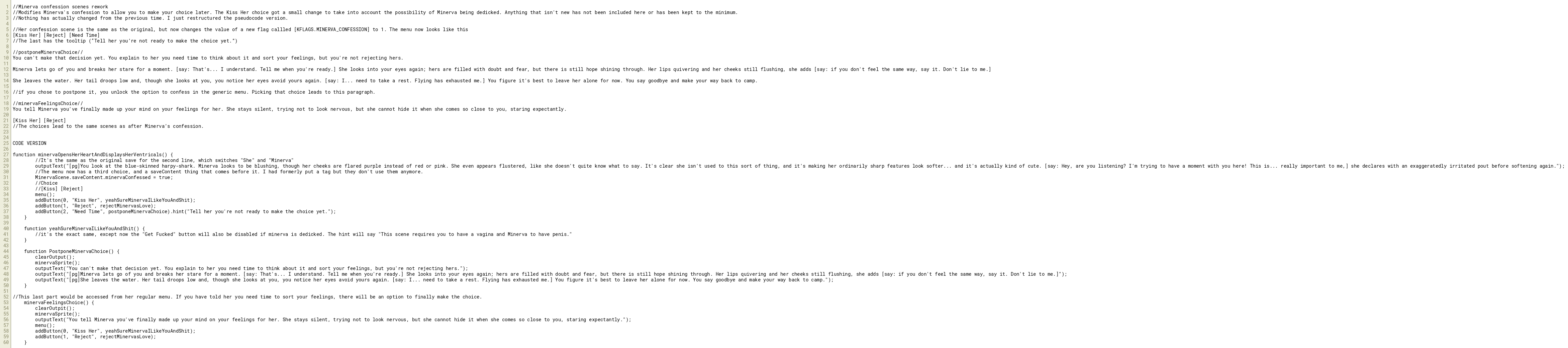 //Modifies Minerva's confession to allow you to make your choice later. The Kiss Her choice got a small change to take into account the possibility of Minerva being dedicked. Anything that isn't new has not been included here or has been kept to the minimum.