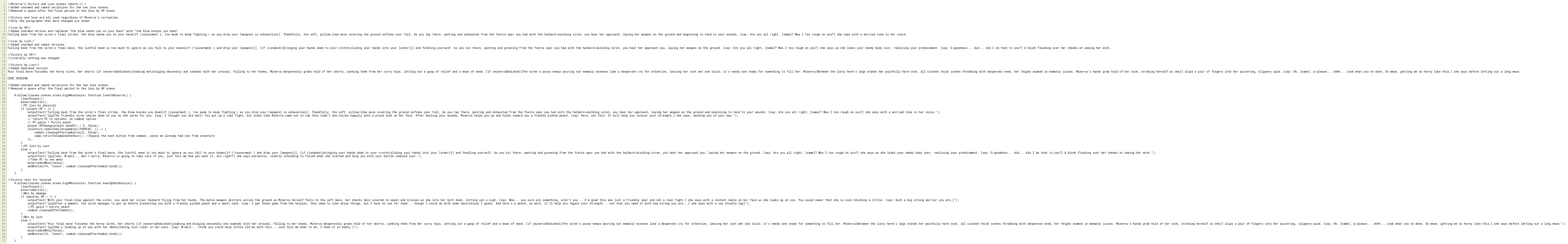 outputText("Your final move finishes the horny siren, her shorts [if (minervaDedicked){soaking wet|bulging obscenely and soaked} with her arousal. Falling to her knees, Minerva desperately grabs hold of her shorts, yanking them from her curvy hips, letting out a gasp of relief and a moan of need. [if (minervaDedicked){The siren's pussy keeps pouring out womanly essence like a desperate cry for attention, leaving her cunt wet and slick; it's needy and ready for something to fill her. Minerva|Between the lusty herm's legs stands her painfully hard cock, all sixteen thick inches throbbing with desperate need, her thighs soaked in womanly juices. Minerva's hands grab hold of her cock, stroking herself as she}] slips a pair of fingers into her quivering, slippery quim. [say: Oh, [name], p-please... ohhh... look what you've done. So mean, getting me so horny like this,] she says before letting out a long moan.");