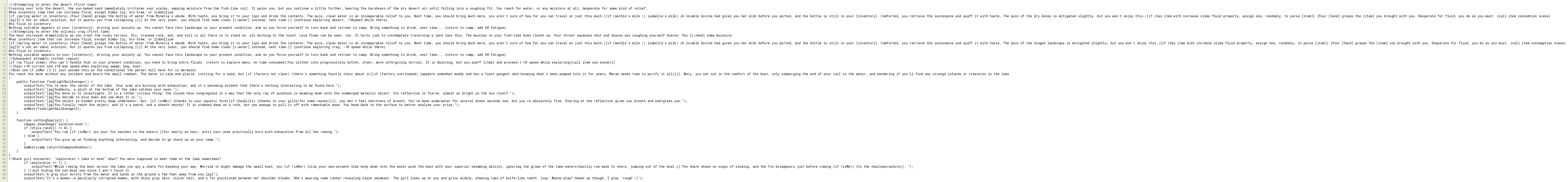 [if (no fluid items) {You can't handle that in your present condition, you need to bring extra fluids. {return to explore menu, no time consumed}|You slither into progressively hotter, dryer, more unforgiving terrain. It is daunting, but you quaff [item] and proceed.{-10 speed while exploring}{call item use scene}}]