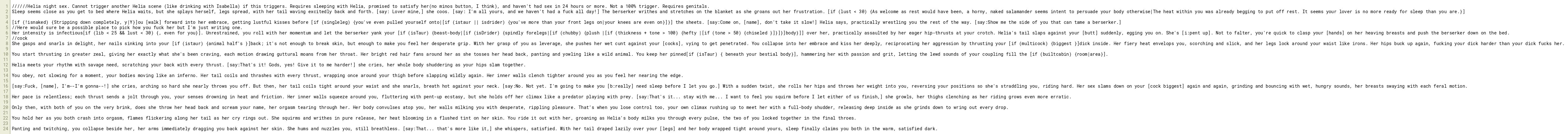 //////Helia night sex. Cannot trigger another Helia scene (like drinking with Isabella) if this triggers. Requires sleeping with Helia, promised to satisfy her(no minos button, I think), and haven't had sex in 24 hours or more. Not a 100% trigger. Requires genitals.