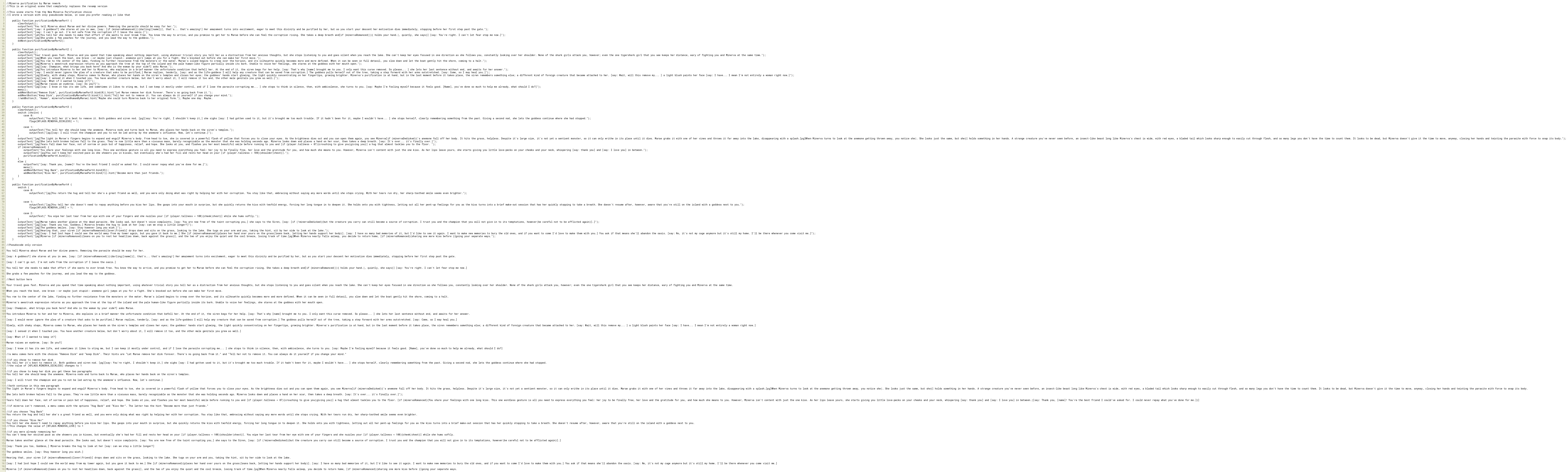 outputText("[pg]Slowly, with shaky steps, Minerva comes to Marae, who places her hands on the siren's temples and closes her eyes; the goddess' hands start glowing, the light quickly concentrating on her fingertips, growing brighter. Minerva's purification is at hand, but in the last moment before it takes place, the siren remembers something else; a different kind of foreign creature that became attached to her. [say: Wait, will this remove my... ] a light blush paints her face [say: I have... I mean I'm not entirely a woman right now.]");