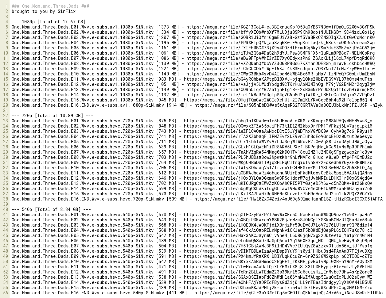One.Mom.and.Three.Dads.E01.Wvv.e-subs.hevc.720p-SiN.mkv [875 MB] - https://mega.nz/file/bbg1hIKR#dwole5bJHxcA-oXKM-aKKvgpkM8SkRHQydNFMVws3_o