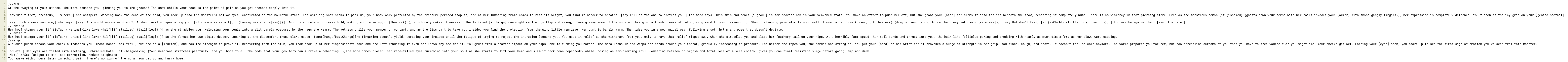 [say:Don't fret, precious, I'm here,] she whispers. Wincing back the ache of the cold, you look up into the monster's hollow eyes, captivated in the mournful stare. The whirling snow seems to pick up, your body only protected by the creature perched atop it, and as her lumbering frame comes to rest its weight, you find it harder to breathe. [say:I'll be the one to protect you,] the mora says. This skin-and-bones [i:ghoul] is far heavier now in your weakened state. You make an effort to push her off, but she grabs your [hand] and slams it into the ice beneath the snow, rendering it completely numb. There is no vibrancy in that piercing stare. Even as the monstrous demon [if (isnaked) {ghosts down your torso with her nails|invades your [armor] with those gangly fingers}], her expression is completely detached. You flinch at the icy grip on your [genitalsdetail].