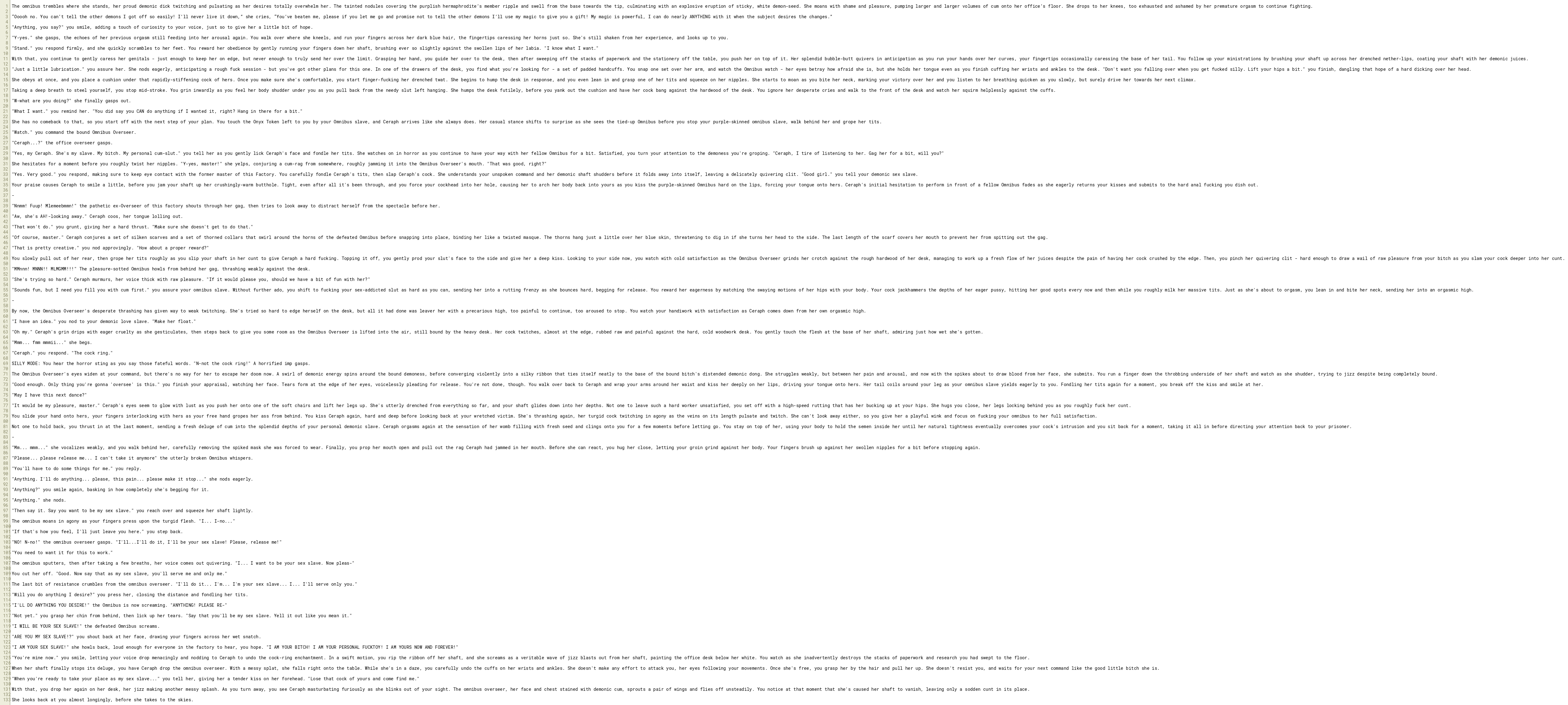 With that, you drop her again on her desk, her jizz making another messy splash. As you turn away, you see Ceraph masturbating furiously as she blinks out of your sight. The omnibus overseer, her face and chest stained with demonic cum, sprouts a pair of wings and flies off unsteadily. You notice at that moment that she's caused her shaft to vanish, leaving only a sodden cunt in its place.