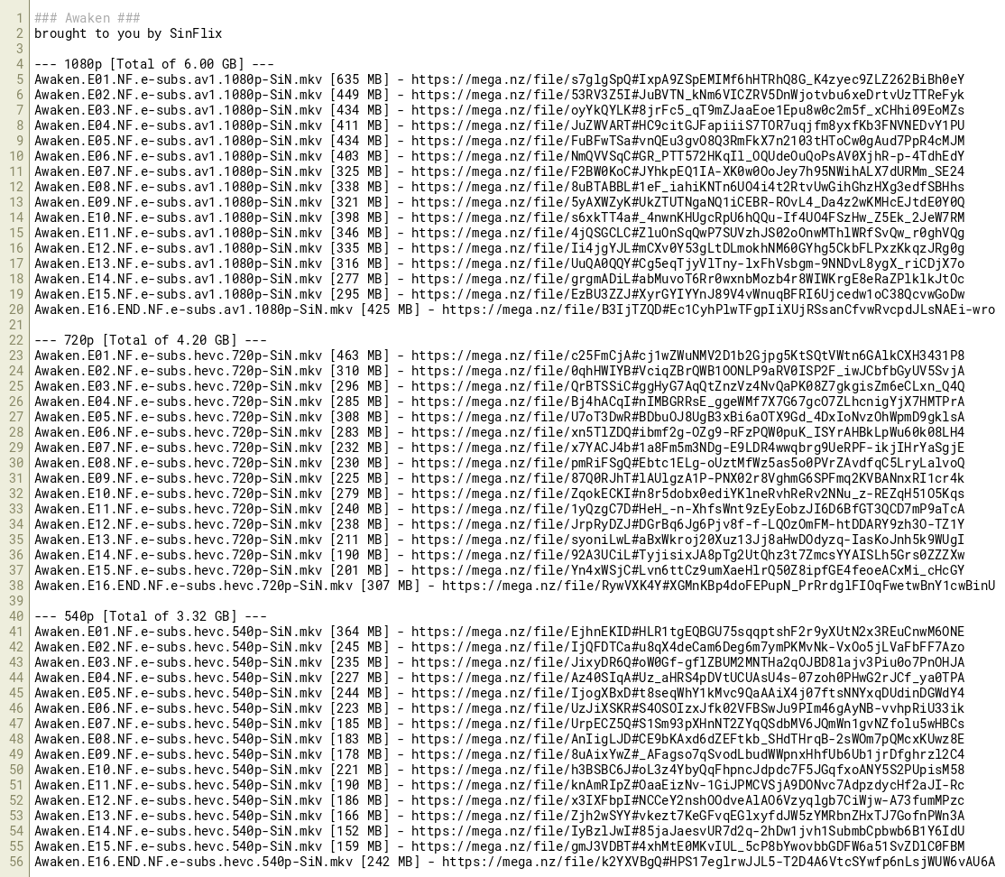Awaken.E01.NF.e-subs.hevc.540p-SiN.mkv [364 MB] - https://mega.nz/file/EjhnEKID#HLR1tgEQBGU75sqqptshF2r9yXUtN2x3REuCnwM6ONE