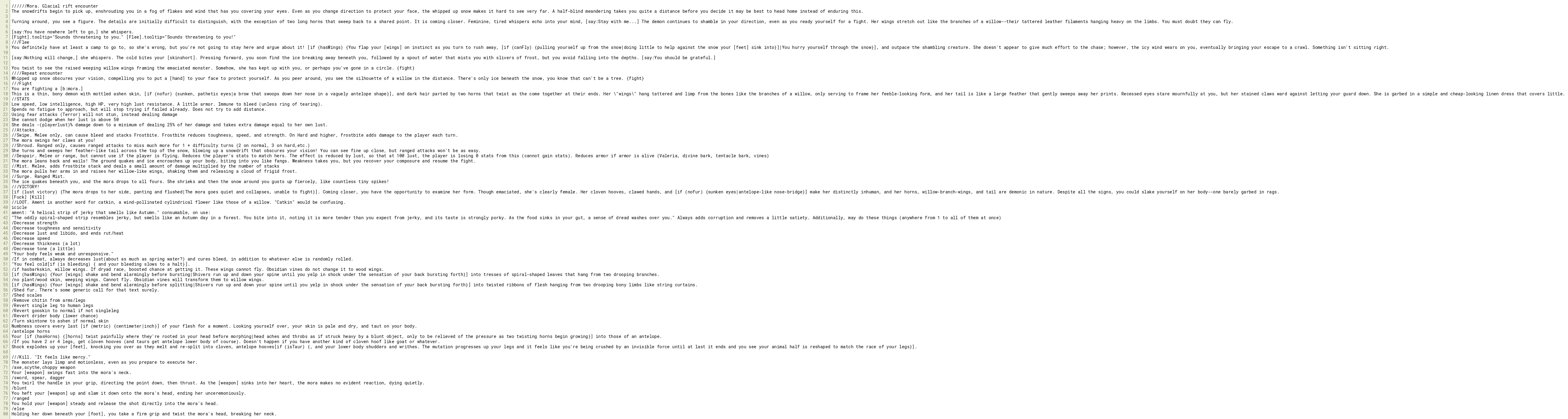 [if (lust victory) {The mora drops to her side, panting and flushed|The mora goes quiet and collapses, unable to fight}]. Coming closer, you have the opportunity to examine her form. Though emaciated, she's clearly female. Her cloven hooves, clawed hands, and [if (nofur) {sunken eyes|antelope-like nose-bridge}] make her distinctly inhuman, and her horns, willow-branch-wings, and tail are demonic in nature. Despite all the signs, you could slake yourself on her body--one barely garbed in rags.