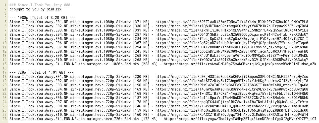 Since.I.Took.You.Away.E11.END.NF.sin-autogen.hevc.720p-SiN.mkv [172 MB] - https://mega.nz/file/yogwzTba#1ynTWHHp20Tqx3kxnDP2nolfgpOf2gMVhYM9ZFY_tGI