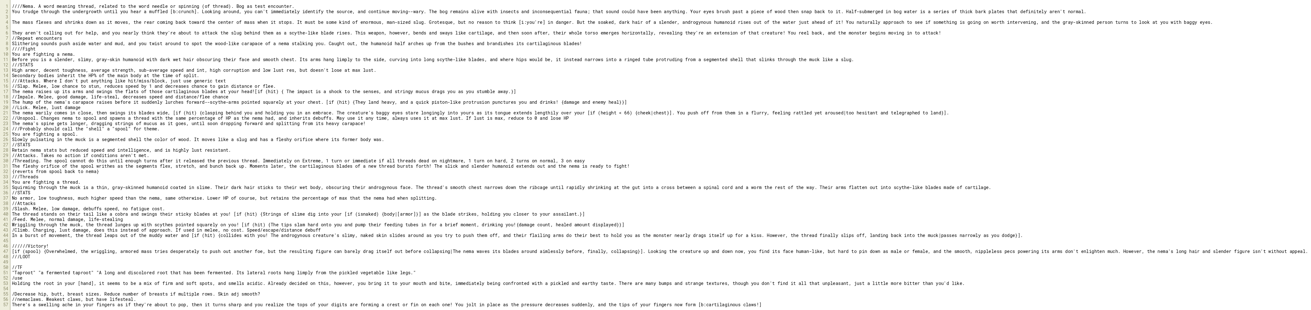In a burst of movement, the thread leaps out of the muddy water and [if (hit) {collides with you! The androgynous creature's slimy, naked skin slides around as you try to push them off, and their flailing arms do their best to hold you as the monster nearly drags itself up for a kiss. However, the thread finally slips off, landing back into the muck|passes narrowly as you dodge}].