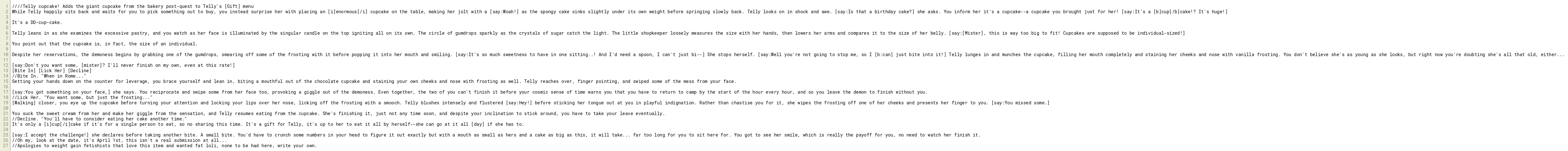 While Telly happily sits back and waits for you to pick something out to buy, you instead surprise her with placing an [i]enormous[/i] cupcake on the table, making her jolt with a [say:Woah!] as the spongy cake sinks slightly under its own weight before springing slowly back. Telly looks on in shock and awe. [say:Is that a birthday cake?] she asks. You inform her it's a cupcake--a cupcake you brought just for her! [say:It's a [b]cup[/b]cake!? It's huge!]