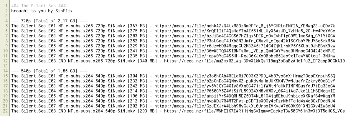 The.Silent.Sea.E03.NF.e-subs.x264.540p-SiN.mkv [242 MB] - https://mega.nz/file/yv5V3QYC#XIy8VXnSG471jlfWWtNfgHkPIMFMBusYdJ7tEg33xGA