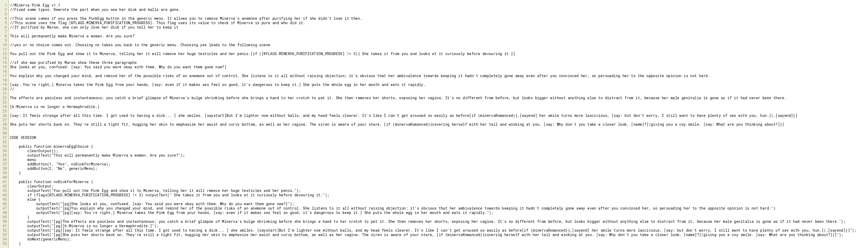 You pull out the Pink Egg and show it to Minerva, telling her it will remove her huge testicles and her penis.[if ([KFLAGS.MINERVA_PURIFICATION_PROGRESS] != 3){ She takes it from you and looks at it curiously before devouring it.}]