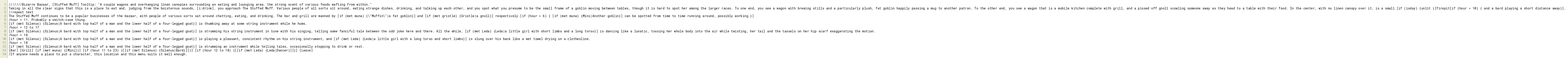 The Stuffed Muff continues to be a popular businesses of the bazaar, with people of various sorts sat around chatting, eating, and drinking. The bar and grill are manned by [if (met muna) {\"Muffin\"|a fat goblin}] and [if (met gristle) {Gristle|a gnoll}] respectively.[if (hour > 6) { [if (met muna) {Mini|Another goblin}] can be spotted from time to time running around, possibly working.}]