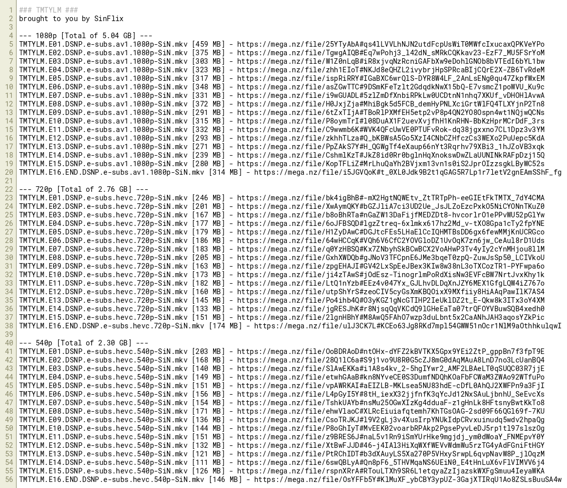 TMTYLM.E13.DSNP.e-subs.av1.1080p-SiN.mkv [271 MB] - https://mega.nz/file/PpZAkS7Y#H_QGWgTf4eXaup66nYt3Rqrhv79XBi3_1hJZoVB3xqk