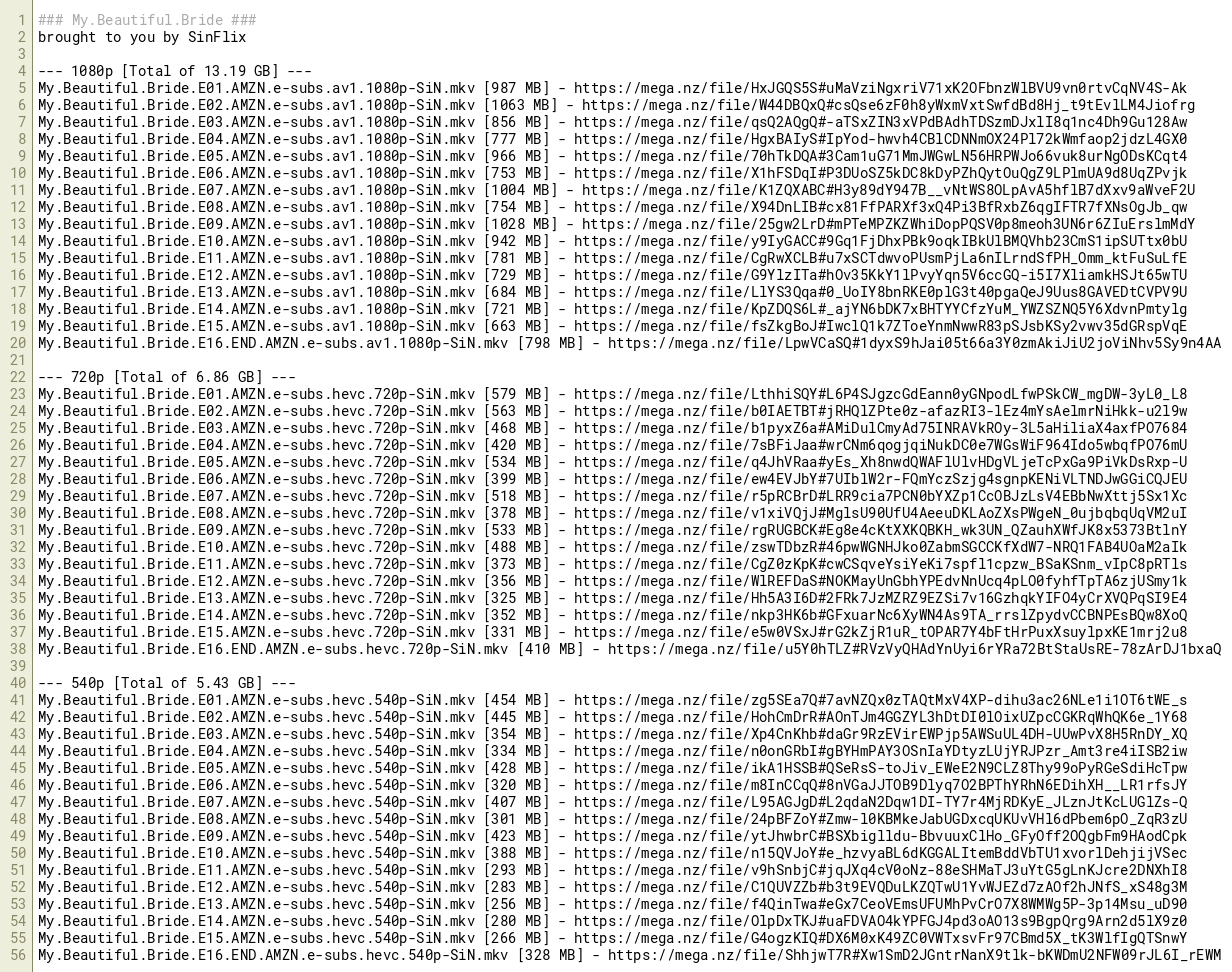 My.Beautiful.Bride.E16.END.AMZN.e-subs.hevc.720p-SiN.mkv [410 MB] - https://mega.nz/file/u5Y0hTLZ#RVzVyQHAdYnUyi6rYRa72BtStaUsRE-78zArDJ1bxaQ