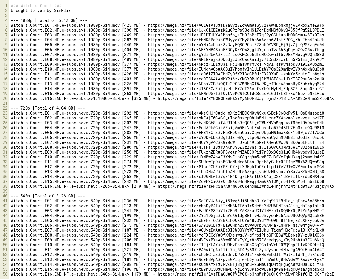 Witch's.Court.E12.NF.e-subs.av1.1080p-SiN.mkv [403 MB] - https://mega.nz/file/cc0TBK4A#MbYR16zxYNGXDRJYjlhWH8T8b-iHYKI8ZPbuBoa2aJ0