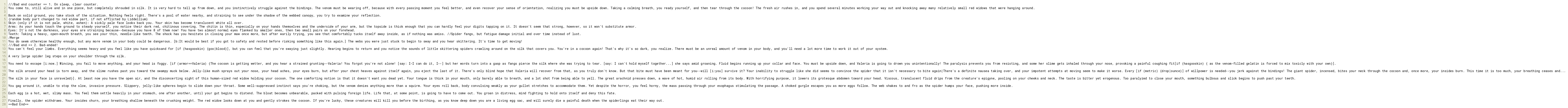 You can't feel your limbs. Everything seems heavy and you feel like you have quicksand for [if (hasgooskin) {goo|blood}], but you can feel that you're swaying just slightly. Hearing begins to return and you notice the sounds of little skittering spiders crawling around on the silk that covers you. You're in a cocoon again! That's why it's so dark, you realize. There must be an unreal amount of venom in your body, and you'll need a lot more time to work it out of your system.