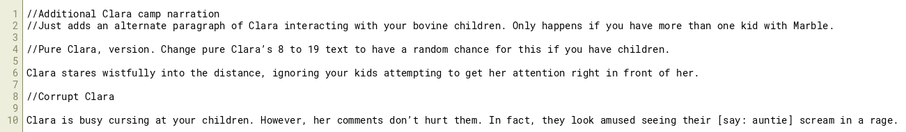 //Just adds an alternate paragraph of Clara interacting with your bovine children. Only happens if you have more than one kid with Marble.