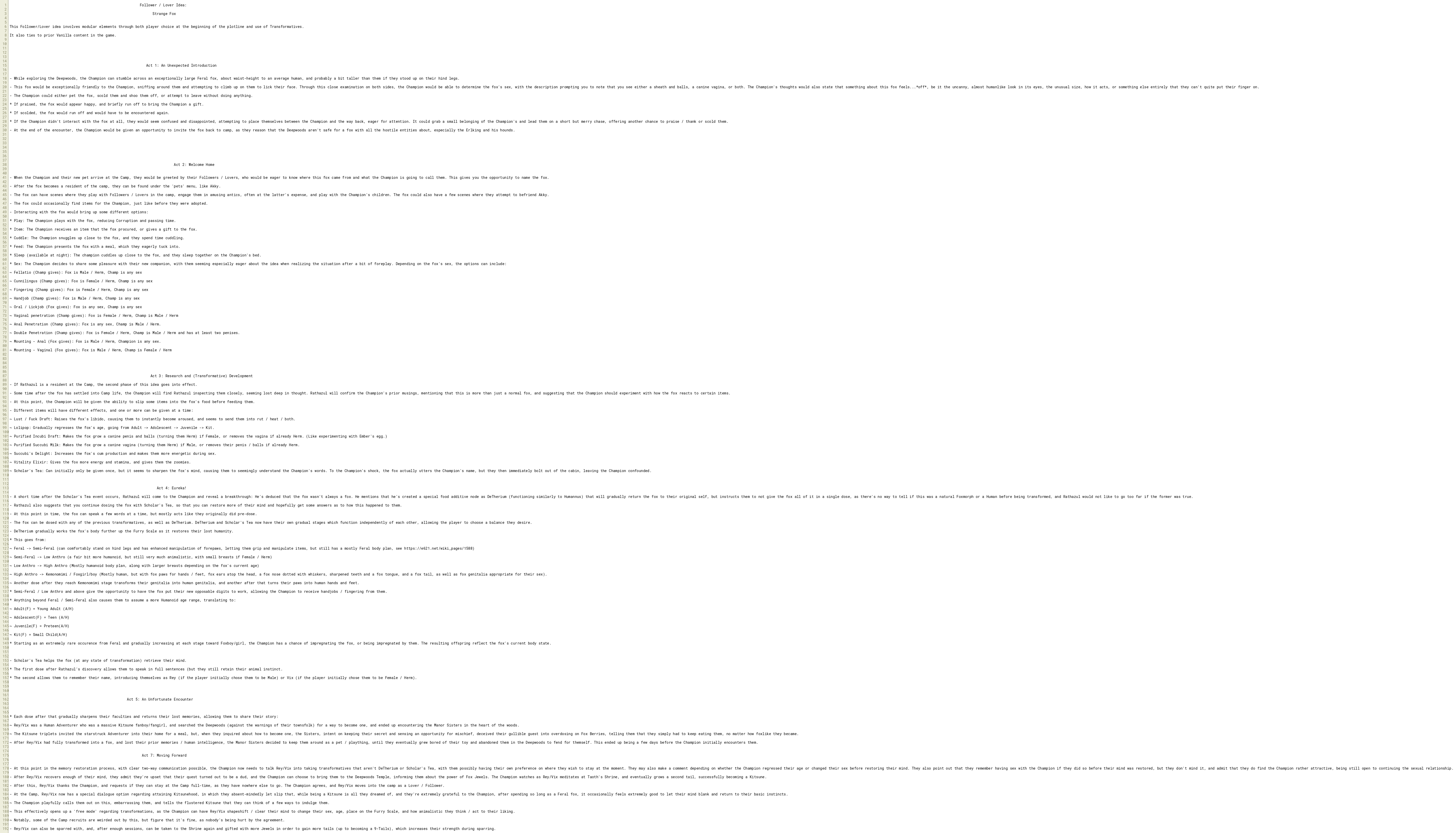 * Semi-Feral / Low Anthro and above give the opportunity to have the fox put their new opposable digits to work, allowing the Champion to receive handjobs / fingering from them.