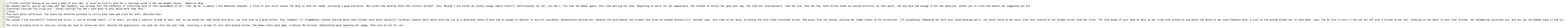 You couldn't kid yourself[if (isChild and silly) {, you're already there!|.}] At heart, you have a sadistic streak to sate, and, as you wound her nude bosom once more, you find this is a good outlet. Your [weapon] [if (flamewhip) {leaves searing marks that flicker with every swing|[if (silwhip) {leaves nasty welts with the tip in a delicious taste of what she so sought to deliver to you|[if (succwhip) {doubtlessly excites her, despite the pain|leaves red streaks that draw out pained whines}]}]}]. Another lash, this time on her wing, straining the thin flesh stretched across. She yelps from the wounds, pulling her limbs closer in for protection. [if (singleleg) {Smacking her with your [leg]|Kicking her}], you shift focus on her back, even less covered by her skimpy corset than her front. The loud snaps of your whip as well as her cries echo around as you paint the abuse on her once-flawless skin. A lull in the sadism allows her to calm down. [say: You do love to hurt--] You cut her off with a strike to her ass, reveling in the shout of pain that follows. Her whimpering satisfies you, and you let the moment hang in the air.