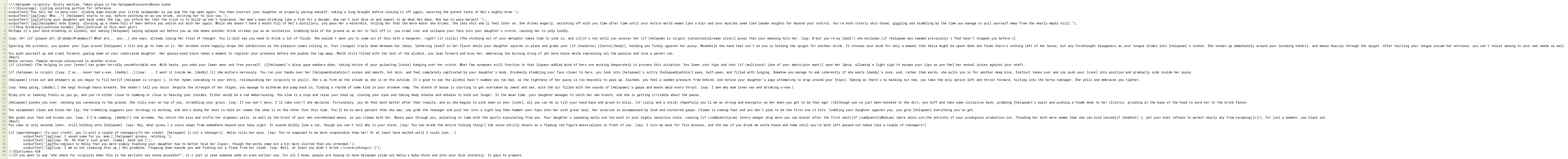 outputText("[pg]You explain to Helia that you were simply teaching your daughter how to better hold her liquor, though the words come out a bit more slurred than you intended.");