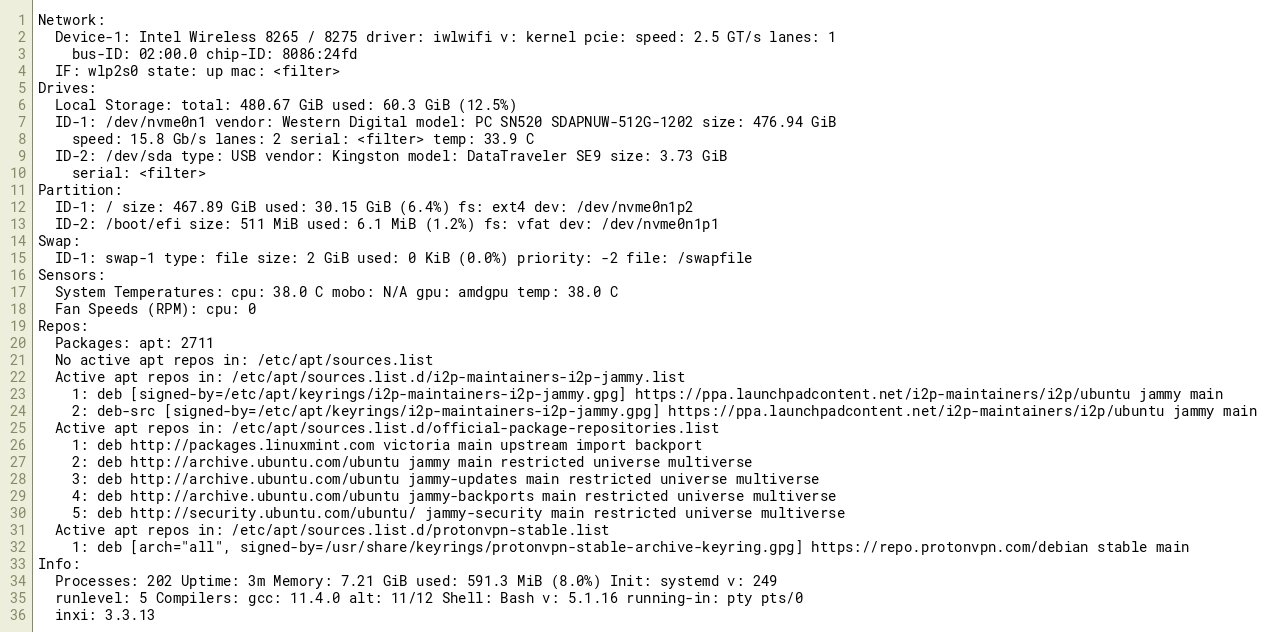System Temperatures: cpu: 38.0 C mobo: N/A gpu: amdgpu temp: 38.0 C