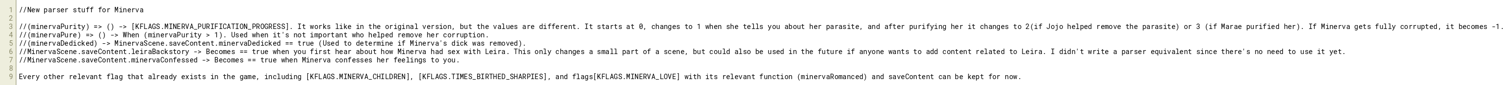 Every other relevant flag that already exists in the game, including [KFLAGS.MINERVA_CHILDREN], [KFLAGS.TIMES_BIRTHED_SHARPIES], and flags[KFLAGS.MINERVA_LOVE] with its relevant function (minervaRomanced) and saveContent can be kept for now.